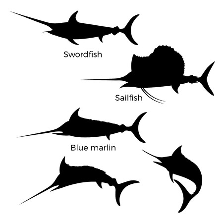 白人分離かじきメカジキ バショウカジキ 青のマーリンの黒いシルエットのセット のイラスト素材 ベクタ Image